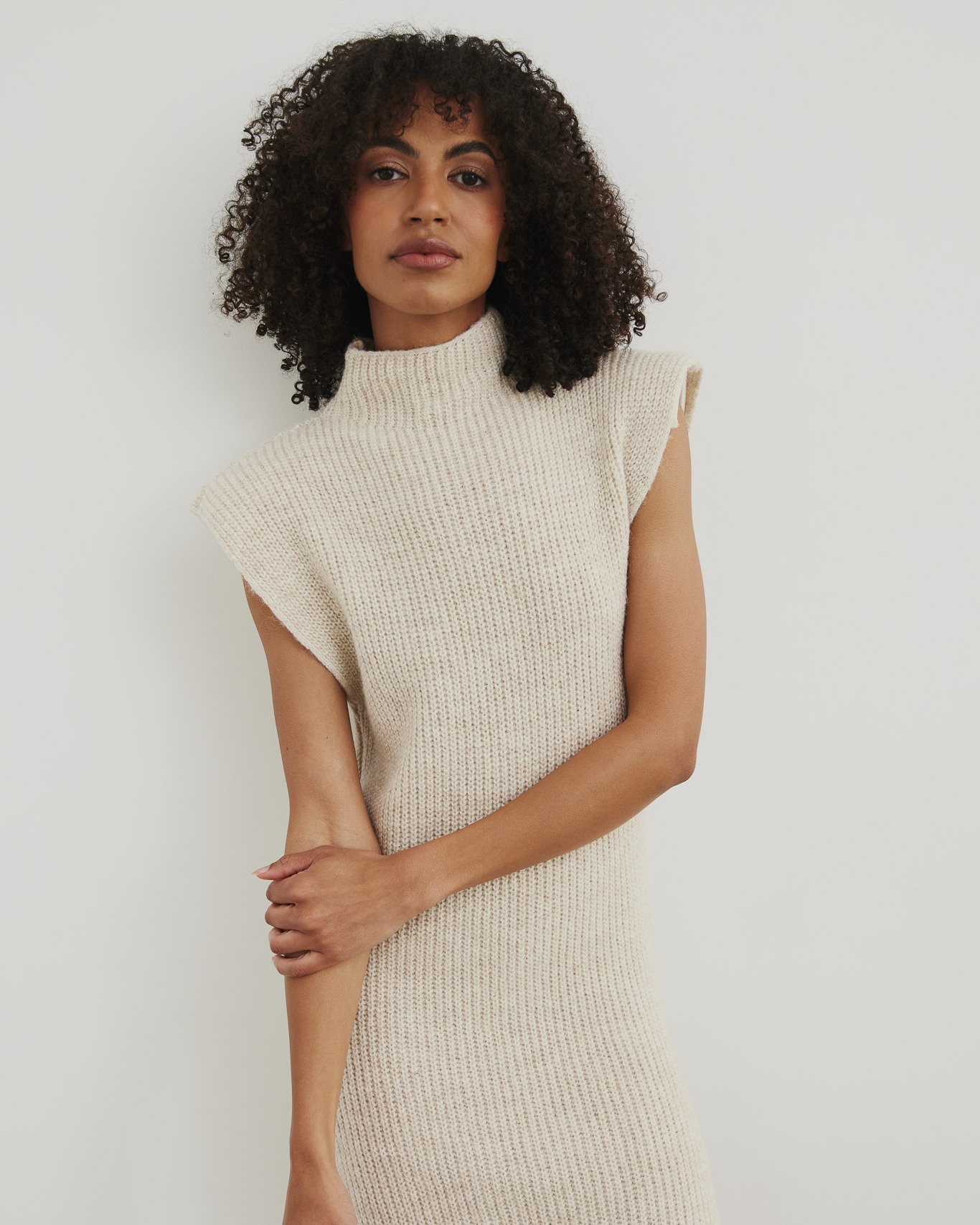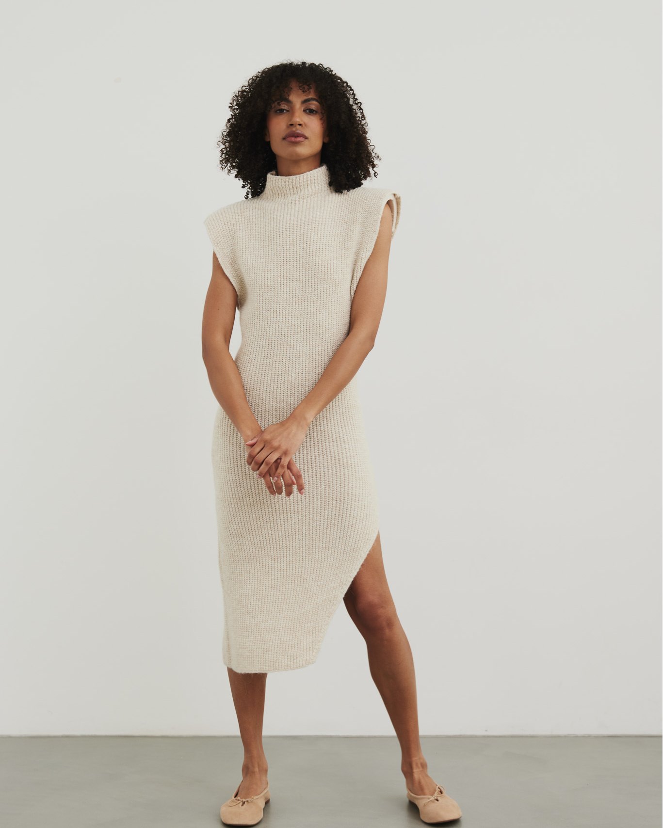 Der asymmetrische Saum und der strukturierte Rollkragen verleihen dem Kleid einen modischen Akzent und eine besondere Note. Ob kombiniert mit schlichten Flats oder eleganten Stiefeln – dieses Kleid ist ein vielseitiger Favorit, der in keinem Kleiderschrank fehlen sollte.